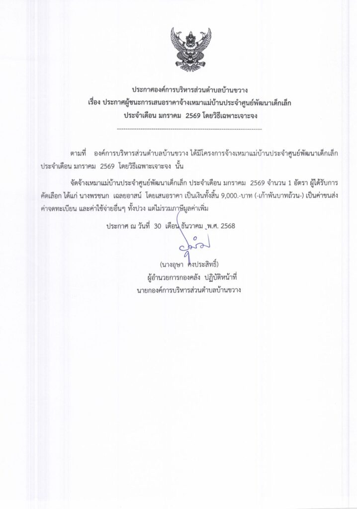 ประกาศองค์การบริหารส่วนตำบลบ้านขวาง เรื่อง ประกาศผู้ชนะการเสนอราคาจ้างเหมาแม่บ้านประจำศูนย์พัฒนาเด็กเล็ก ประจำเดือน มกราคม 2569 โดยวิธีเฉพาะเจาะจง Post published:30 ธันวาคม 2025 Post category:ข่าวจัดซื้อจัดจ้าง