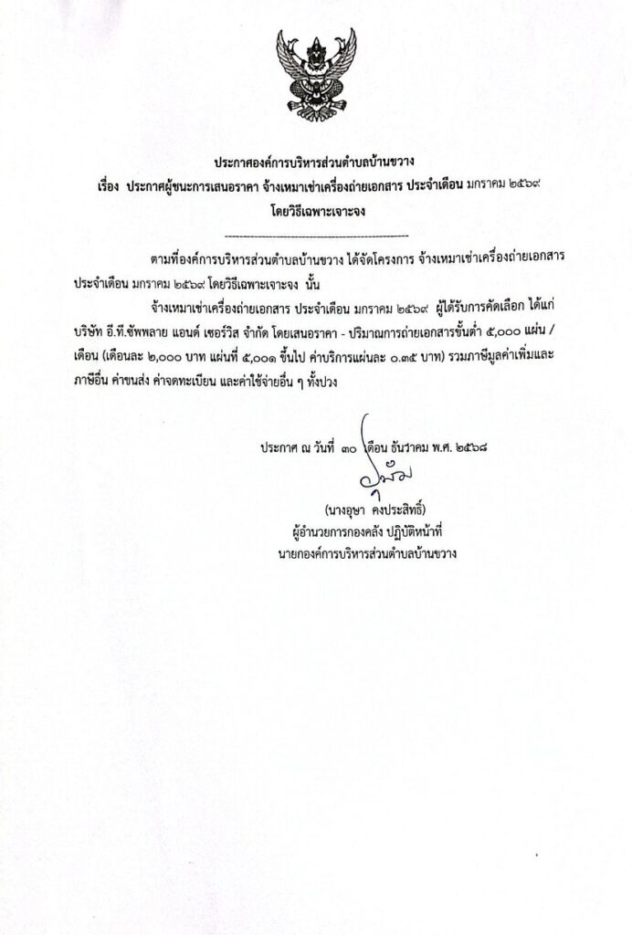 ประกาศองค์การบริหารส่วนตำบลบ้านขวาง เรื่อง ประกาศผู้ชนะการเสนอราคา จ้างเหมาเช่าเครื่องถ่ายเอกสาร ประจำเดือน มกราคม 2569 โดยวิธีเฉพาะเจาะจง Post published:30 ธันวาคม 2025 Post category:ข่าวจัดซื้อจัดจ้าง
