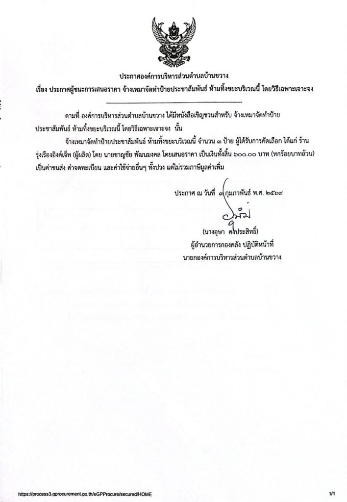 ประกาศองค์การบริหารส่วนตำบลบ้านขวาง เรื่อง ประกาศผู้ชนะการเสนอราคา จ้างเหมาจัดทำป้ายประชาสัมพันธ์ ห้ามทิ้งขยะบริเวณนี้ โดยวิธีเฉพาะเจาะจง Post published:3 กุมภาพันธ์ 2026 Post category:ข่าวจัดซื้อจัดจ้าง