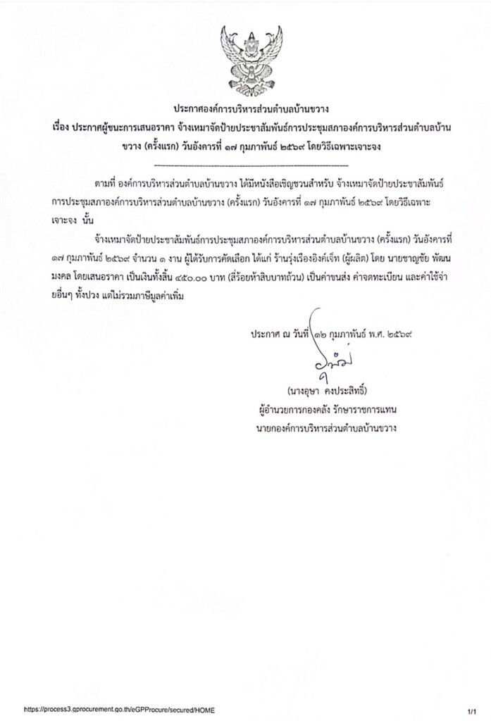 ประกาศองค์การบริหารส่วนตำบลบ้านขวาง เรื่อง ประกาศผู้ชนะการเสนอราคา จ้างเหมาจัดทำป้ายประชาสัมพันธ์การประชุมสภาองค์การบริหารส่วนตำบลบ้านขวาง (ครั้งแรก) วันอังคารที่ 17 กุมภาพันธ์ 2569 โดยวิธีเฉพาะเจาะจง