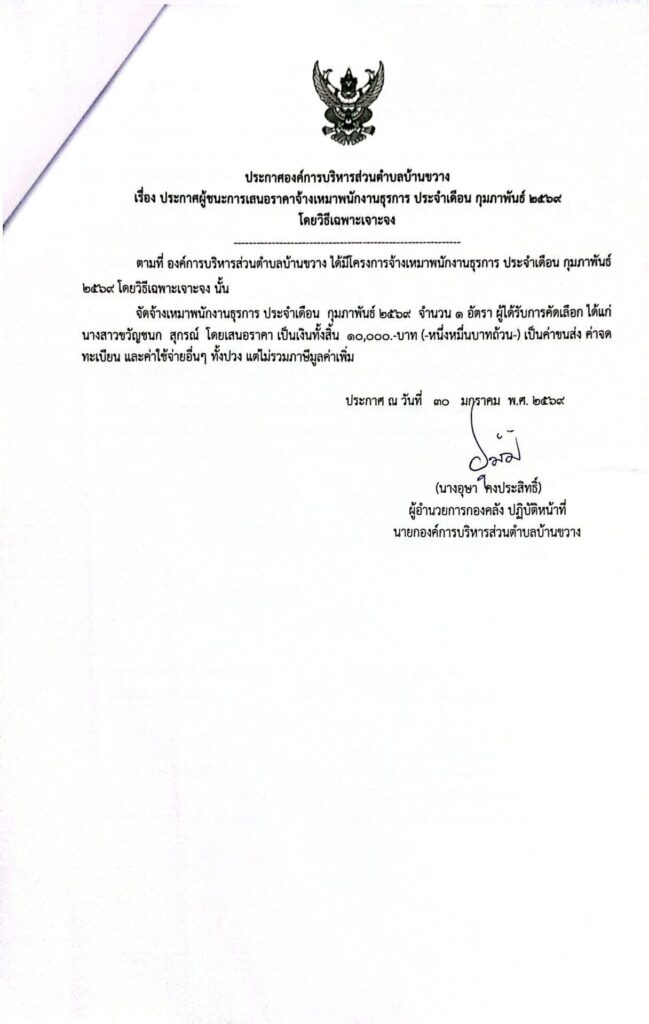 ประกาศองค์การบริหารส่วนตำบลบ้านขวาง เรื่อง ประกาศผู้ชนะการเสนอราคาจ้างเหมาพนักงานธุรการ ประจำเดือน กุมภาพันธ์ 2569 โดยวิธีเฉพาะเจาะจง