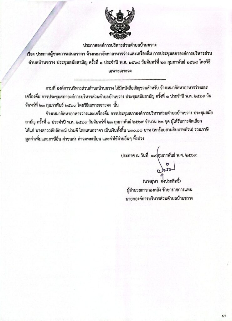 ประกาศองค์การบริหารส่วนตำบลบ้านขวาง เรื่อง ประกาศผู้ชนะการเสนอราคา จ้างเหมาจัดหาอาหารว่างและเครื่องดื่ม การประชุมสภาองค์การบริหารส่วนตำบลบ้านขวาง ประชุมสมัยสามัญ ครั้งที่ 1 ประจำปี พ.ศ.2569 วันจันทร์ที่ 23 กุมภาพันธ์ 2569 โดยวิธีเฉพาะเจาะจง Post published:19 กุมภาพันธ์ 2026 Post category:ข่าวจัดซื้อจัดจ้าง