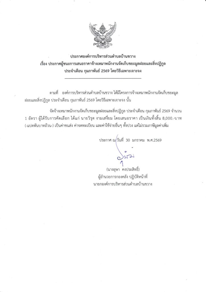ประกาศองค์การบริหารส่วนตำบลบ้านขวาง เรื่อง ประกาศผู้ชนะการเสนอราคาจ้างเหมาพนักงานจัดเก็บขยะมูลฝอยและสิ่งปฏิกูล ประจำเดือน กุมภาพันธ์ ๒๕๖๙ โดยวิธีเฉพาะเจาะจง Post published:30 มกราคม 2026 Post category:ข่าวจัดซื้อจัดจ้าง