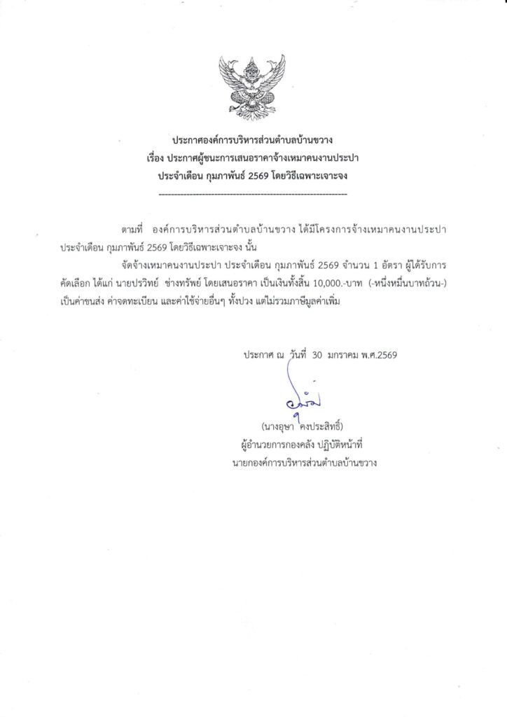 ประกาศองค์การบริหารส่วนตำบลบ้านขวาง เรื่อง ประกาศผู้ชนะการเสนอราคาจ้างเหมาคนงานประปา ประจำเดือน กุมภาพันธ์ ๒๕๖๙ โดยวิธีเฉพาะเจาะจง Post published:30 มกราคม 2026 Post category:ข่าวจัดซื้อจัดจ้าง