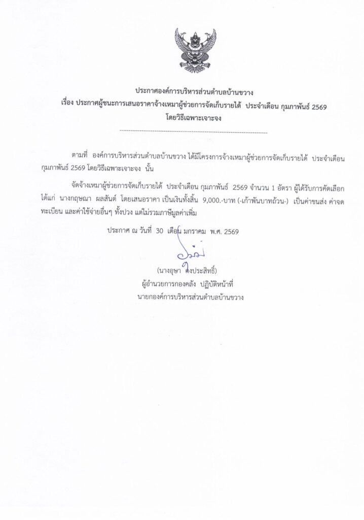 ประกาศองค์การบริหารส่วนตำบลบ้านขวาง เรื่อง ประกาศผู้ชนะการเสนอราคาจ้างเหมาผู้ช่วยการจัดเก็บรายได้ ประจำเดือน กุมภาพันธ์  2569  โดยวิธีเฉพาะเจาะจง