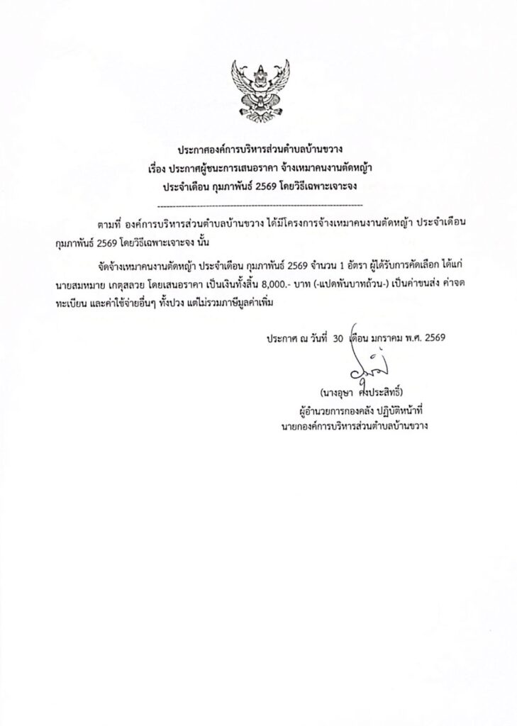 ประกาศองค์การบริหารส่วนตำบลบ้านขวาง เรื่อง ประกาศผู้ชนะการเสนอราคา จ้างเหมาคนงานตัดหญ้า ประจำเดือน กุมภาพันธ์ 2569 โดยวิธีเฉพาะเจาะจง