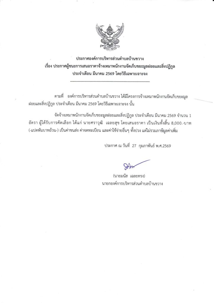 ประกาศองค์การบริหารส่วนตำบลบ้านขวาง เรื่อง ประกาศผู้ชนะการเสนอราคาจ้างเหมาพนักงานจัดเก็บขยะมูลฝอยและสิ่งปฏิกูล ประจำเดือน มีนาคม ๒๕๖๙ โดยวิธีเฉพาะเจาะจง Post published:27 กุมภาพันธ์ 2026 Post category:ข่าวจัดซื้อจัดจ้าง