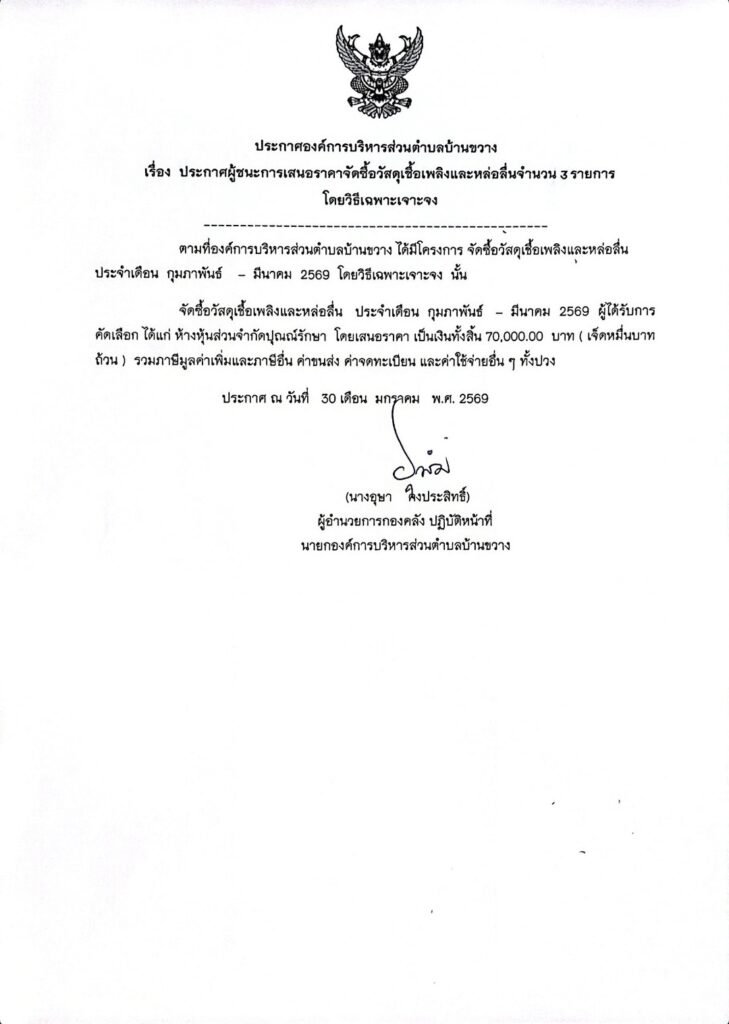 ประกาศองค์การบริหารส่วนตำบลบ้านขวาง เรื่อง ประกาศผู้ชนะการ้สนอราคาจัดซื้อวัสดุเชื้อเพลิงและหล่อลื่น จำนวน 3 รายการ โดยวิธีเฉพาะเจาะจง