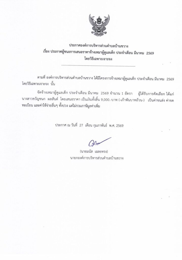 ประกาศองค์การบริหารส่วนตำบลบ้านขวาง เรื่อง ประกาศผู้ชนะการเสนอราคาจ้างเหมาผู้ดูแลเด็ก ประจำเดือน มีนาคม  2569  โดยวิธีเฉพาะเจาะจง