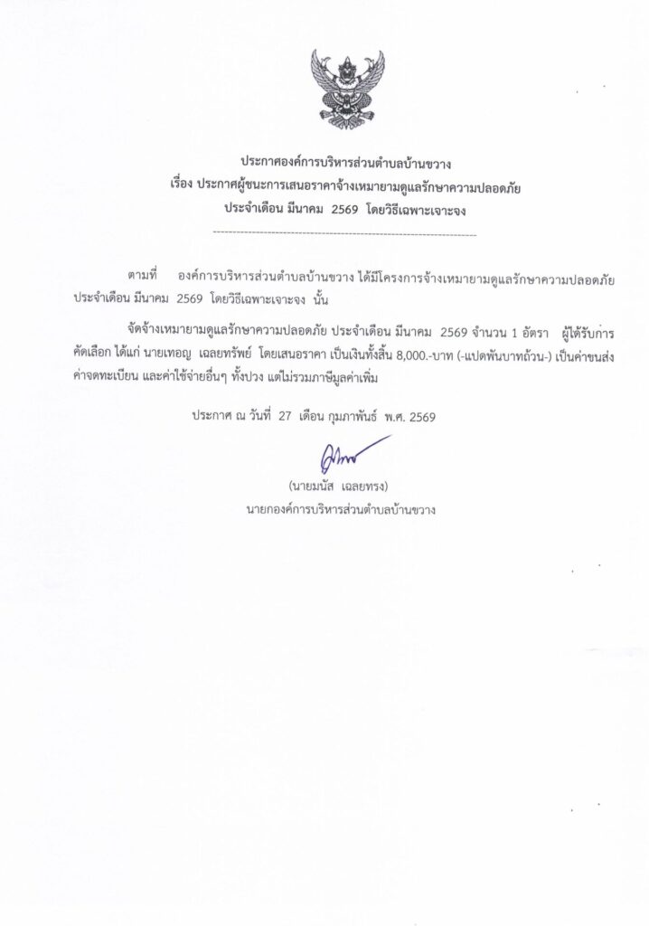 ประกาศองค์การบริหารส่วนตำบลบ้านขวาง เรื่อง ประกาศผู้ชนะการเสนอราคาจ้างเหมายามดูแลรักษาความปลอดภัย ประจำเดือน  มีนาคม  2569  โดยวิธีเฉพาะเจาะจง