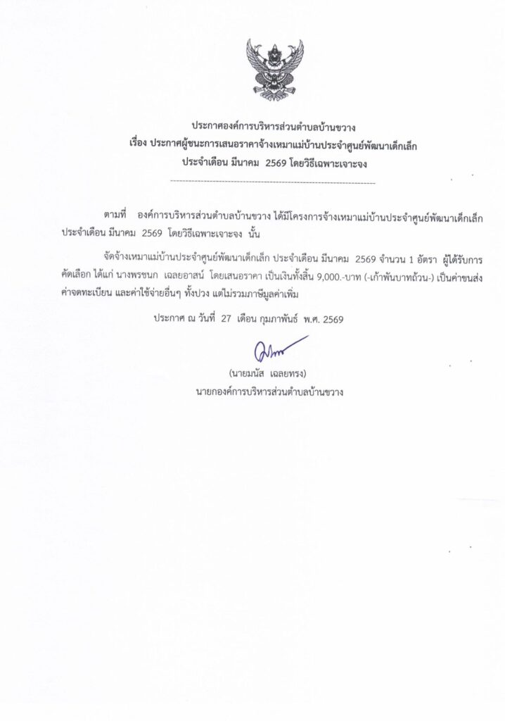 ประกาศองค์การบริหารส่วนตำบลบ้านขวาง เรื่อง ประกาศผู้ชนะการเสนอราคาจ้างเหมาแม่บ้านประจำศูนย์พัฒนาเด็กเล็ก ประจำเดือน มีนาคม 2569 โดยวิธีเฉพาะเจาะจง Post published:27 กุมภาพันธ์ 2026 Post category:ข่าวจัดซื้อจัดจ้าง