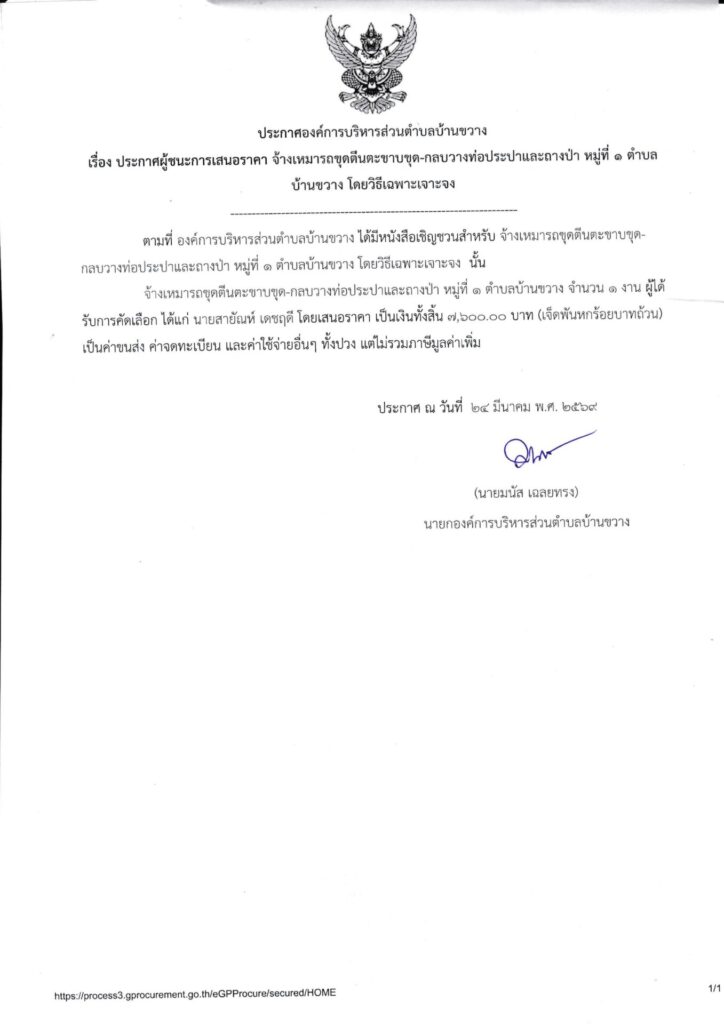 ประกาศองค์การบริหารส่วนตำบลบ้านขวาง เรื่อง ประกาศผู้ชนะการเสนอราคา จ้างเหมารถขุดตีนตะขาบขุด-กลบวางท่อประปาและถางป่า หมู่ที่ ๑ ตำบลบ้านขวาง โดยวิธีเฉพาะเจาะจง Post published:24 มีนาคม 2026 Post category:ข่าวจัดซื้อจัดจ้าง