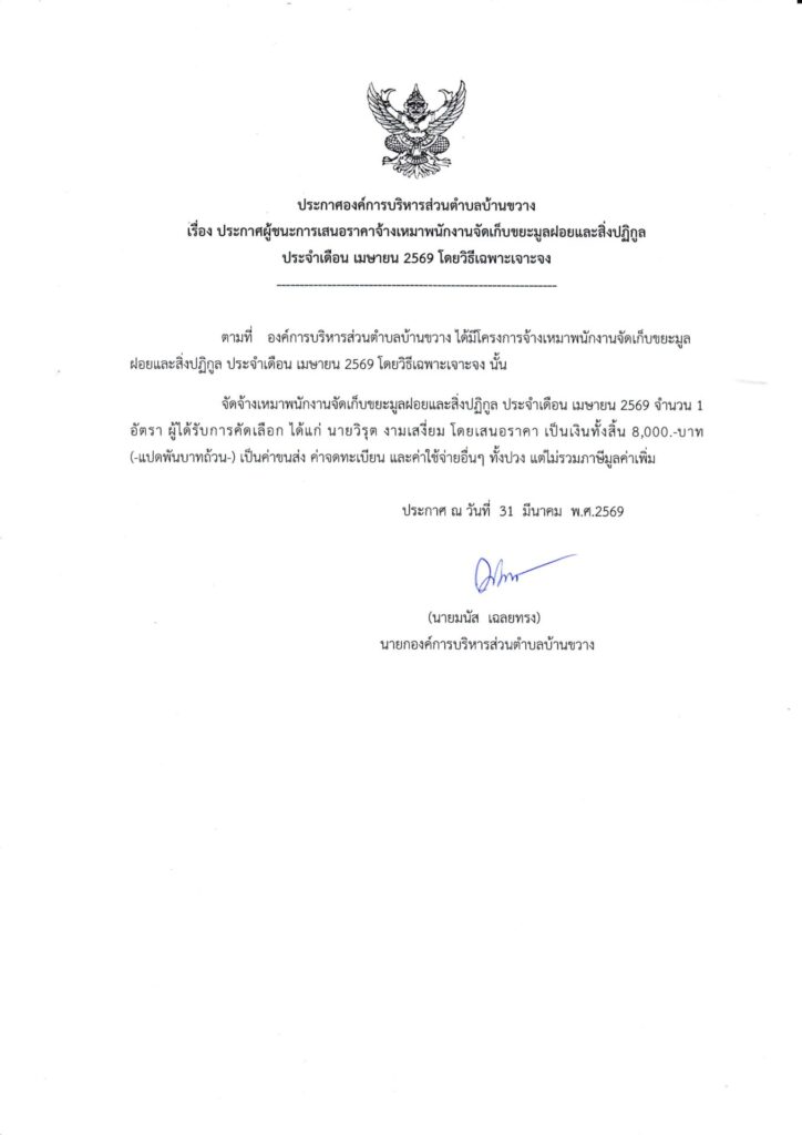 ประกาศองค์การบริหารส่วนตำบลบ้านขวาง เรื่อง ประกาศผู้ชนะการเสนอราคาจ้างเหมาพนักงานจัดเก็บขยะมูลฝอยและสิ่งปฏิกูล ประจำเดือน เมษายน ๒๕๖๙ โดยวิธีเฉพาะเจาะจง