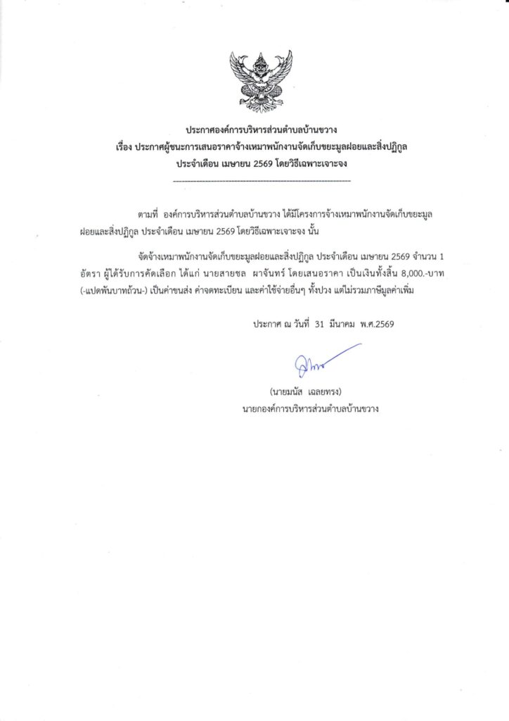 ประกาศองค์การบริหารส่วนตำบลบ้านขวาง เรื่อง ประกาศผู้ชนะการเสนอราคาจ้างเหมาพนักงานจัดเก็บขยะมูลฝอยและสิ่งปฏิกูล ประเดือน เมษายน ๒๕๖๙ โดยวิธีเฉพาะเจาะจง Post published:31 มีนาคม 2026 Post category:ข่าวจัดซื้อจัดจ้าง