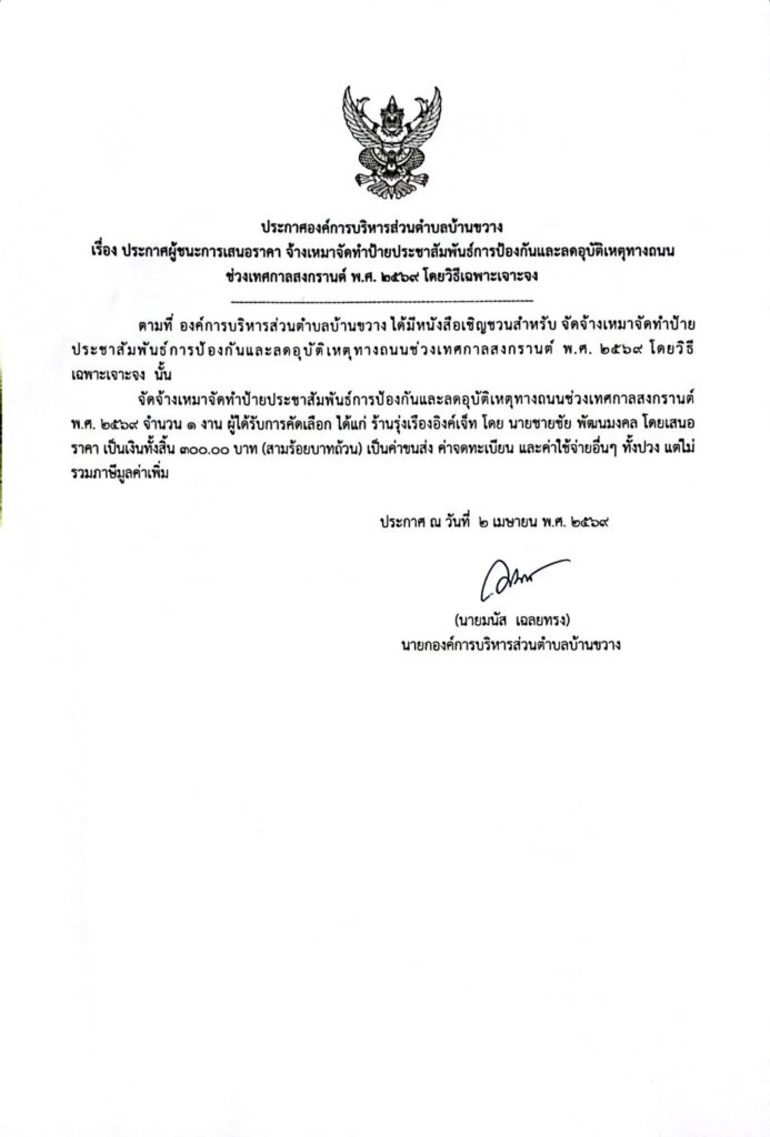 ประกาศองค์การบริหารส่วนตำบลบ้านขวาง เรื่องประกาศผู้ชนะการเสนอราคา จ้างเหมาจัดทำป้ายประชาสัมพันธ์การป้องกันและลดอุบัติเหตุทางถนนช่วงเทศกาลสงกรานต์ พ.ศ.๒๕๖๙ โดยวิธีเฉพาะเจาะจง Post published:2 เมษายน 2026 Post category:ข่าวจัดซื้อจัดจ้าง